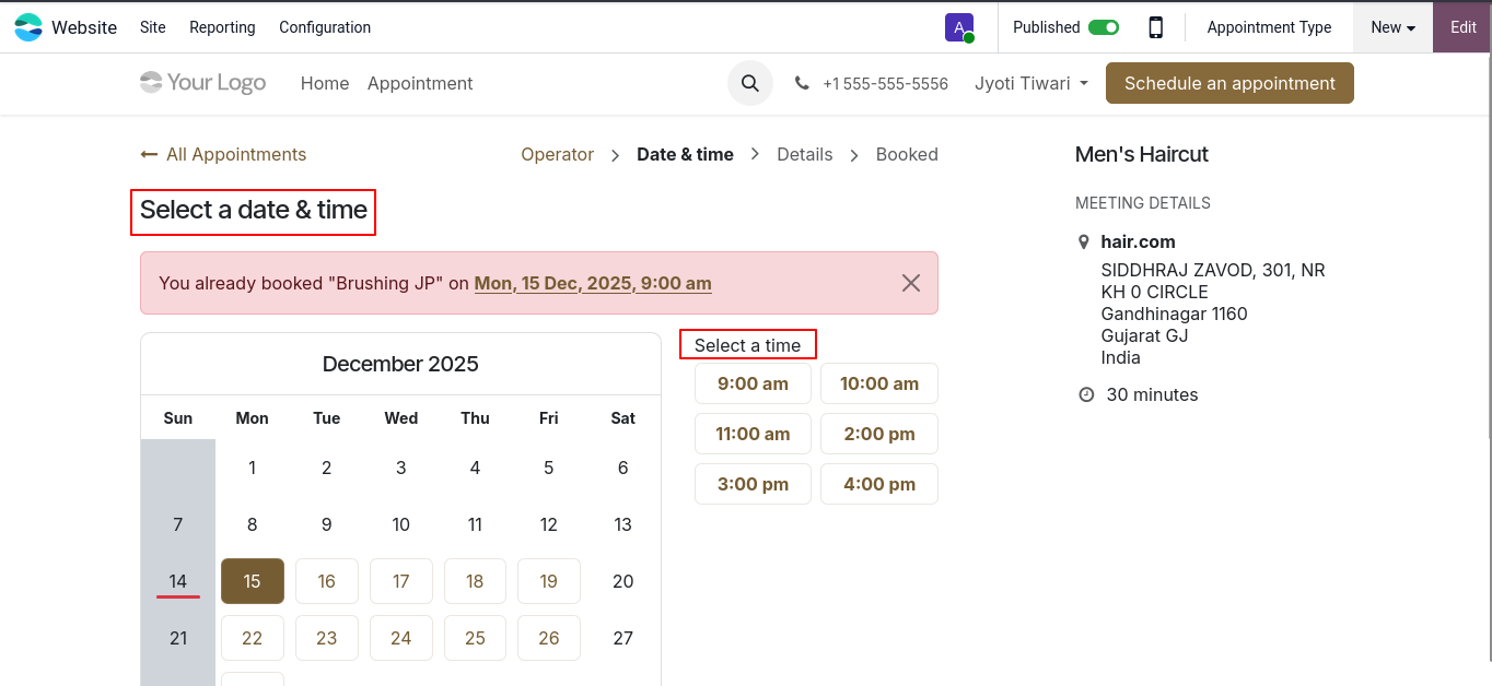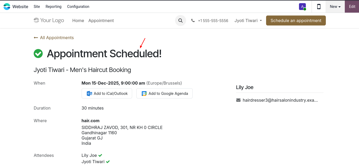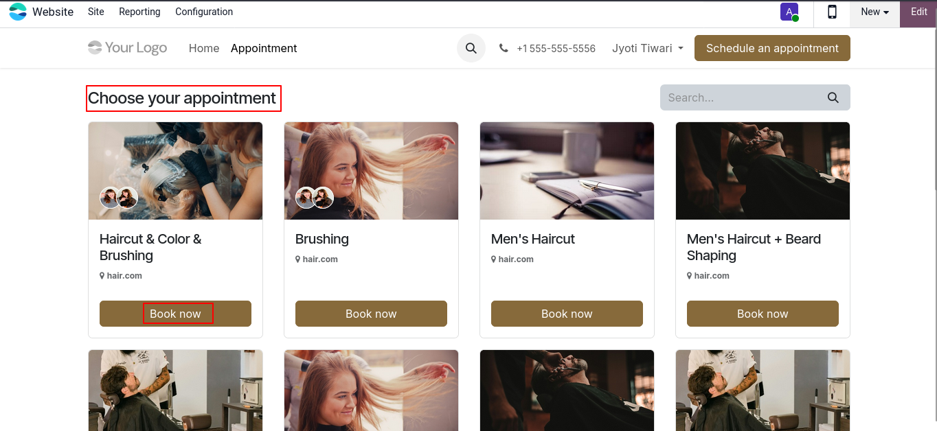 Odoo lets you create a professional salon website where clients can view your services, pricing, stylist details & book appointments online. Online bookings sync with your calendar automatically, reducing manual work & increasing convenience for clients.