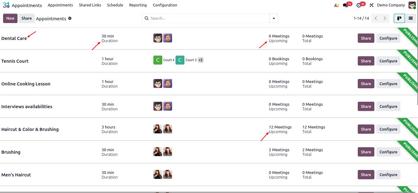 This is the Appointments dashboard, where the admin can view, manage & configure all appointment types along with upcoming & total bookings.