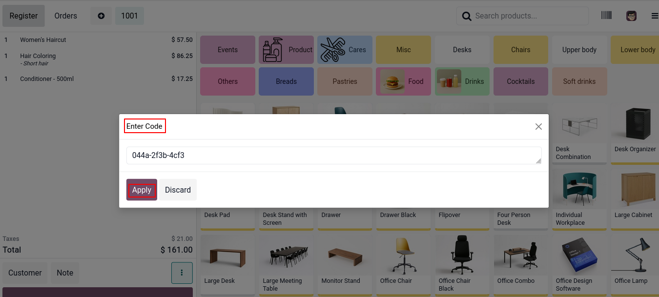 From this screen, the cashier can choose the appropriate price based on the customer or service type. From this screen, the cashier can enter the discount coupon code & apply it to the order.