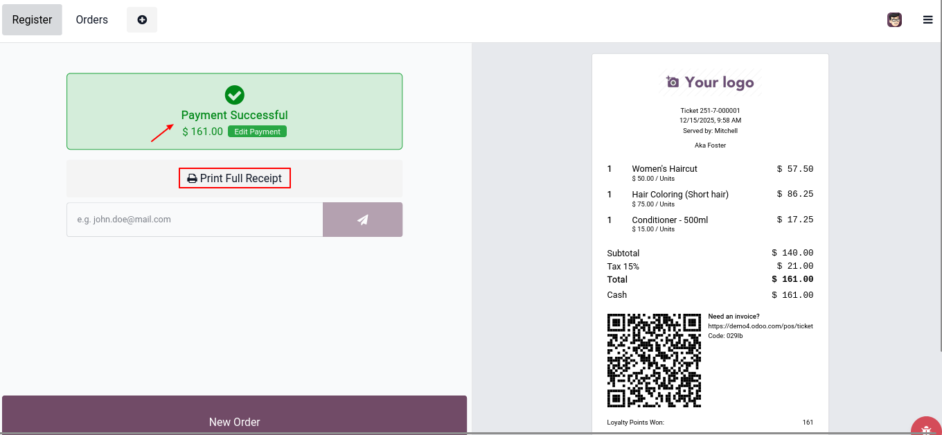 This screen confirms that the payment has been successfully processed & the receipt can be printed or emailed directly to the customer.
