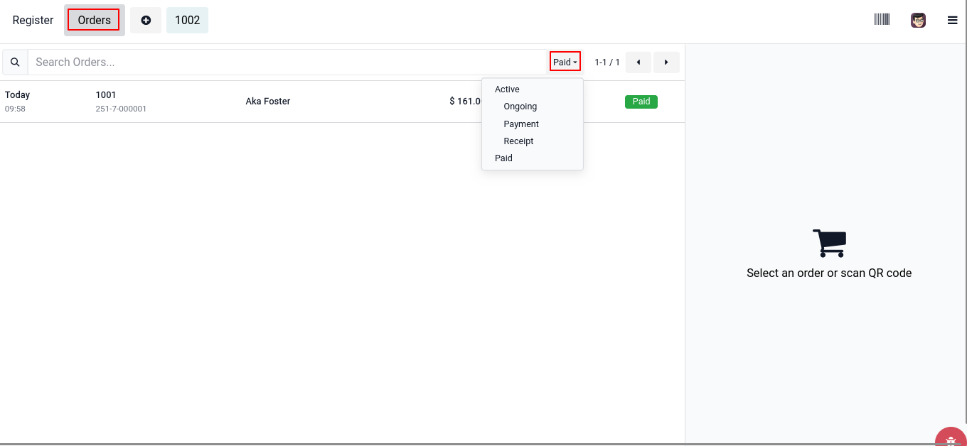 From this screen the cashier can view order details & monitor the order status such as Active, Ongoing, Payment, Receipt & Paid.