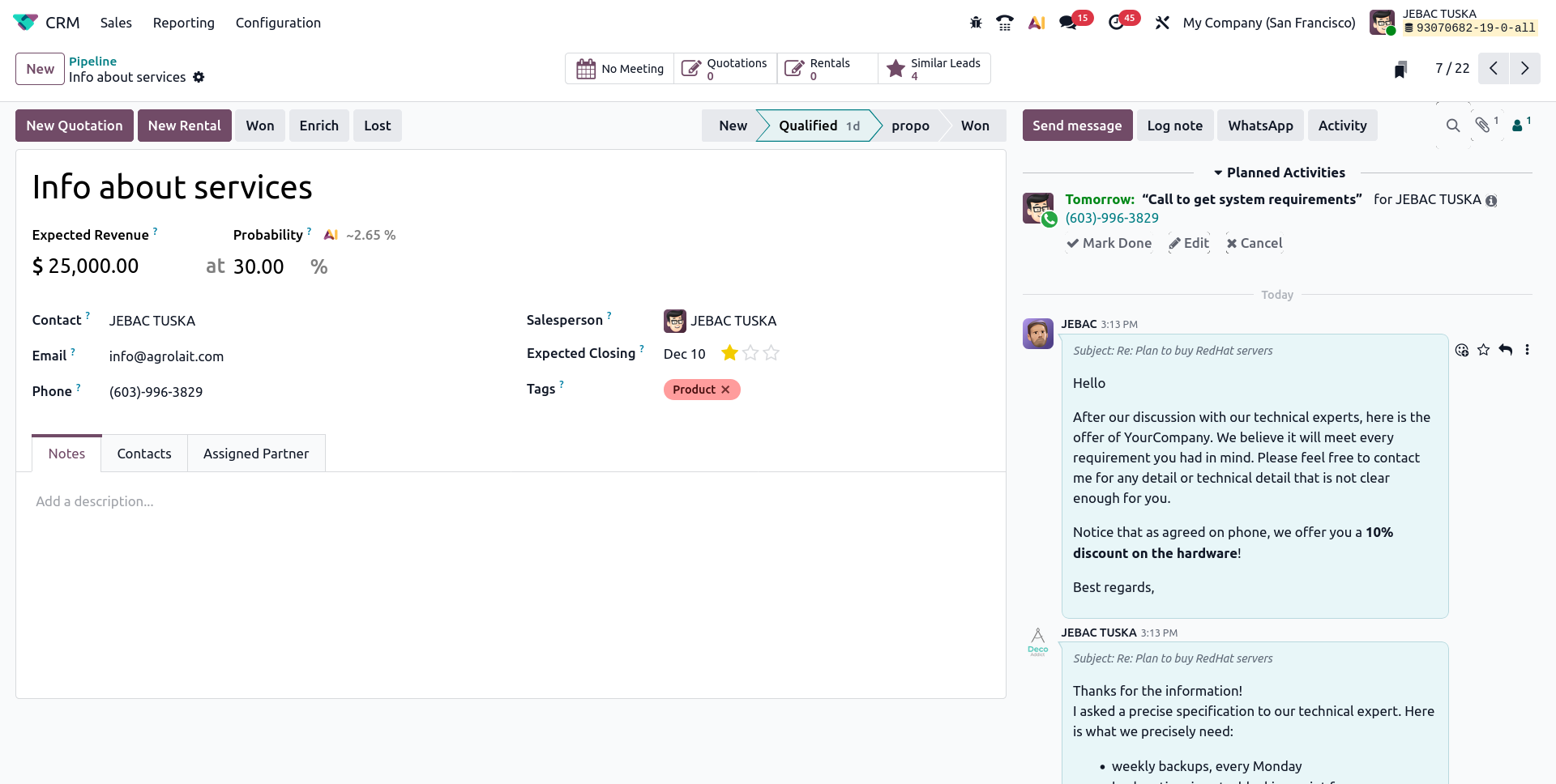 It keeps track of all follow-ups & reminders in an organized way so no customer or lead is ever missed. Odoo automatically recalls you when it’s time to contact a client making communication smoother. Helping businesses maintain strong & timely connections.