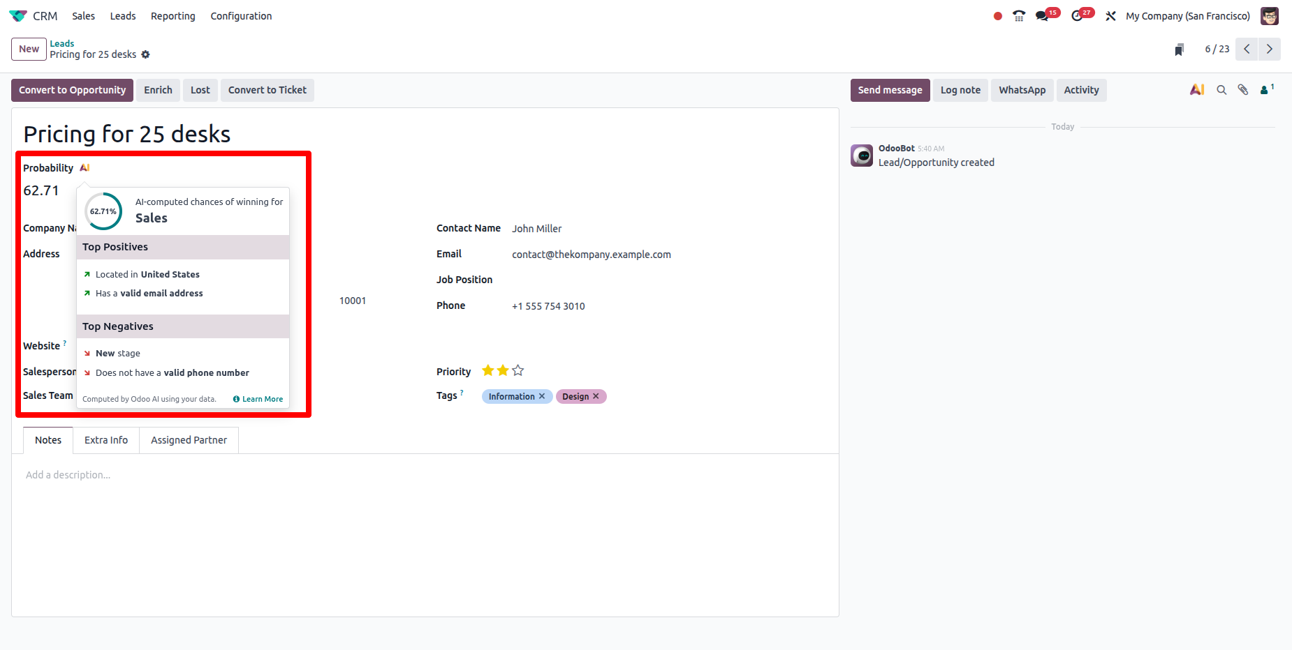 ‣ As AI is everywhere nowadays, Odoo included it into CRM to predict win/loss odds
