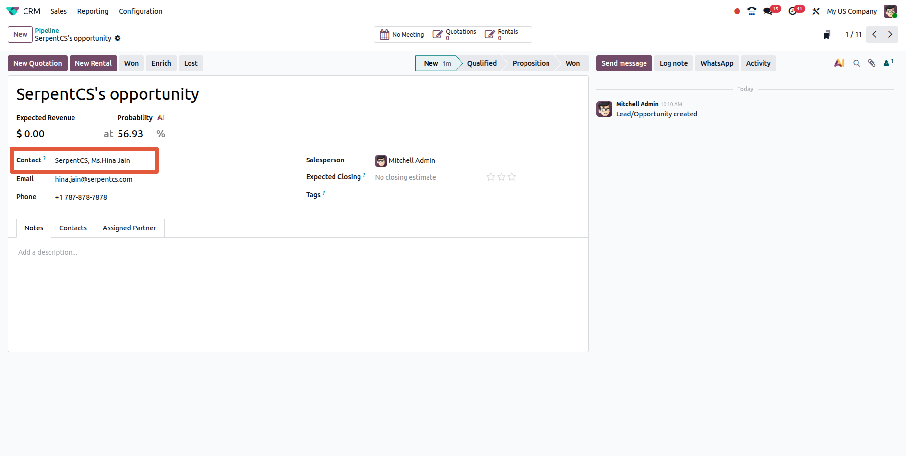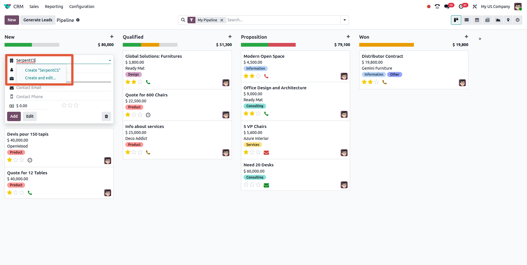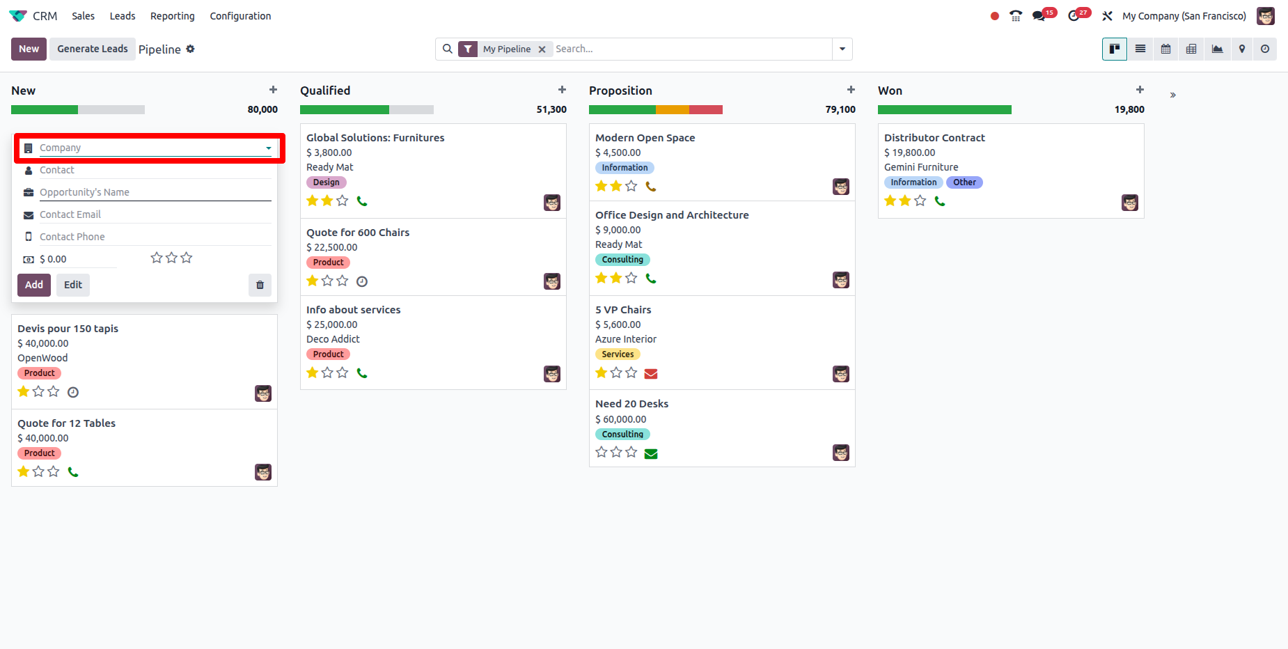 ‣ In new Kanban card of CRM > pipeline > new lead, one more field added named Company which will directly create contact