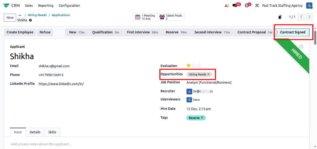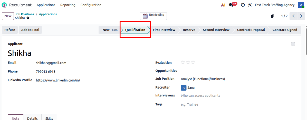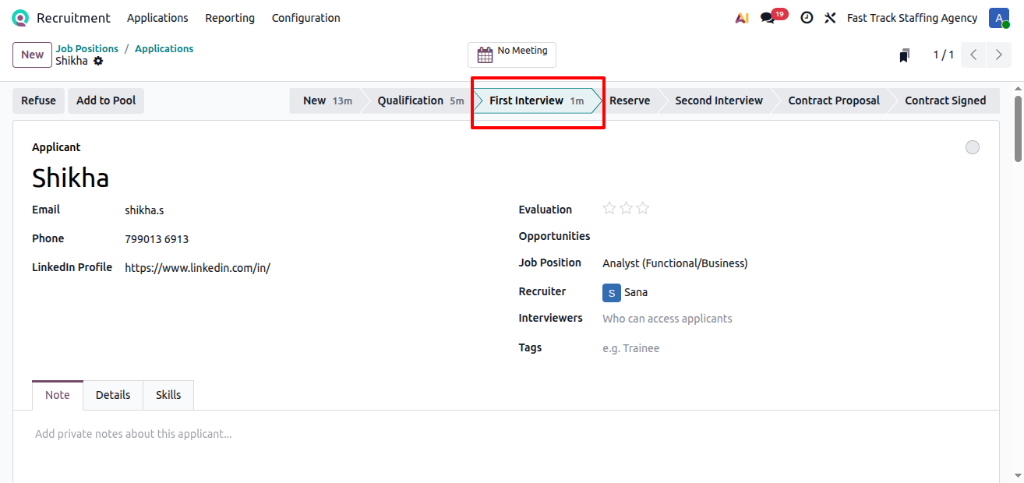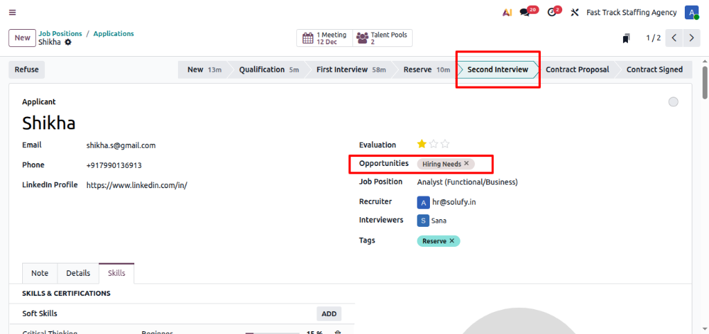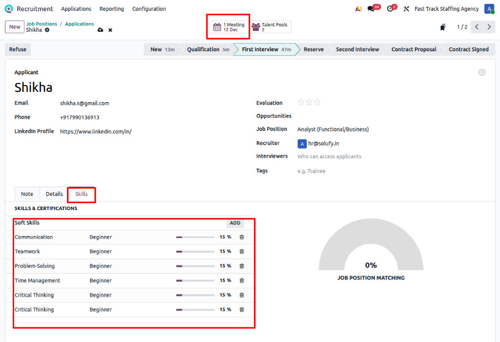 • Skill Assessment: During the interview, the candidate's skills are assessed and added directly to their Odoo record.