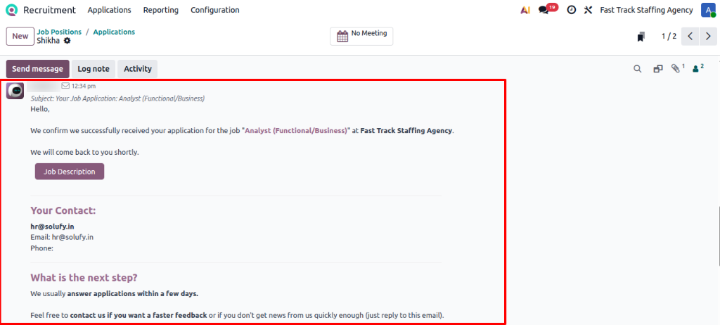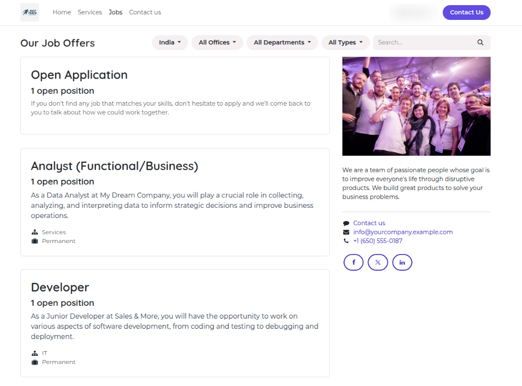• Result: This form instantly creates an Applicant record within the Odoo Recruitment application.