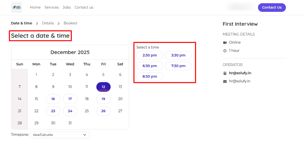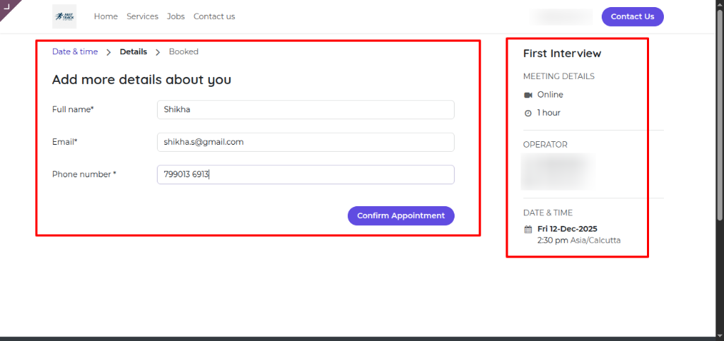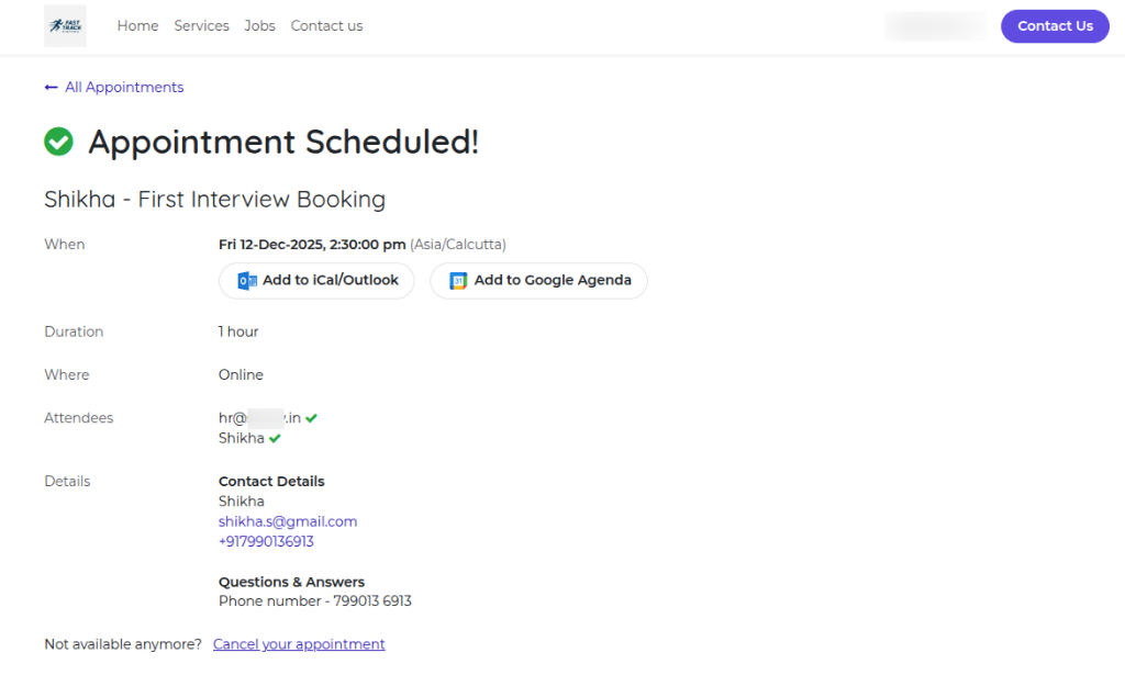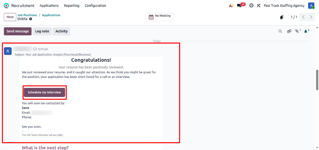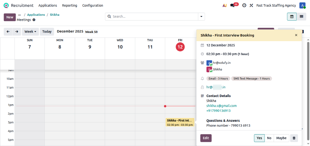 • First Interview: After qualification, the applicant moves to the "First Interview" stage, receiving a mail template with an Appointment link. This allows the candidate to select an interview slot at their convenience, streamlining scheduling.