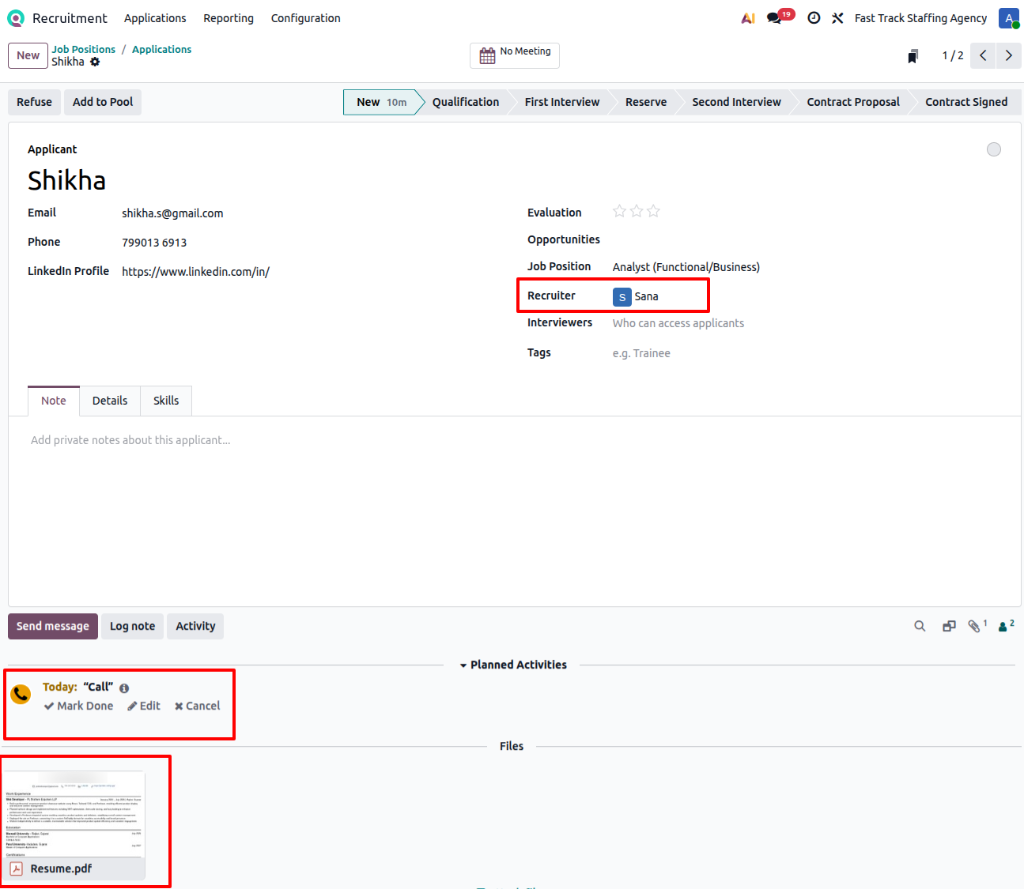 • Automated Activity: An activity for an initial qualification call is automatically created and assigned to the Recruiter.