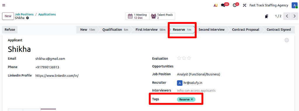 • The Reserve: The candidate is moved to the "Reserve" stage, or can be tagged as "Reserve" at any point, making them immediately available for future opportunities.