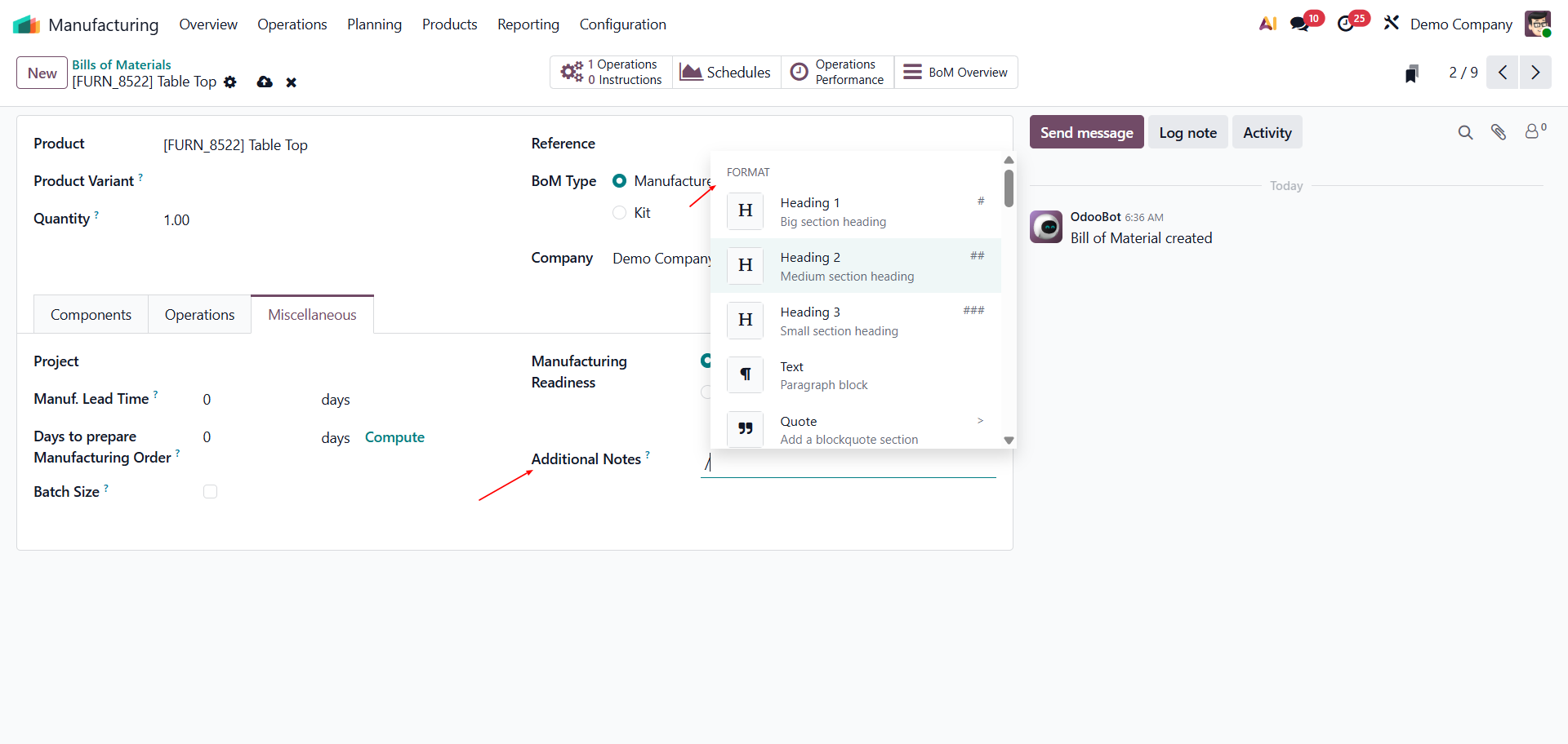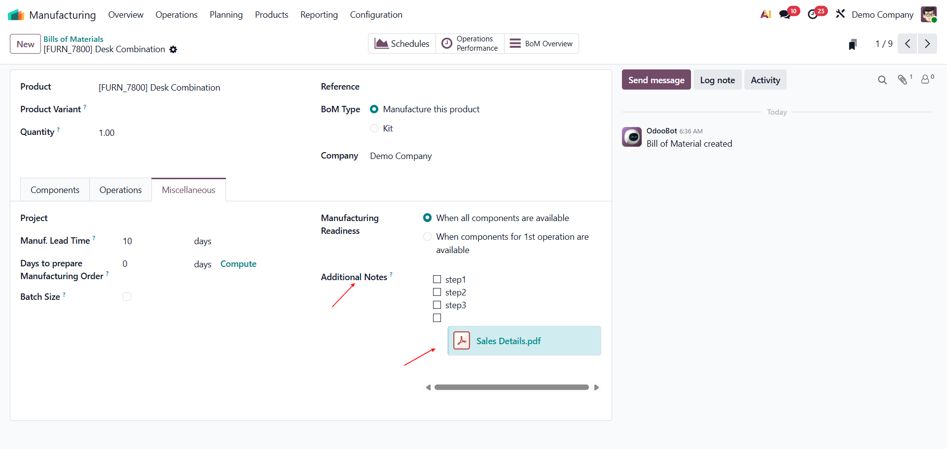 Odoo 19.2 upgraded a new Additional Notes feature under BOM that allows users to record detailed information for any operation performed during manufacturing or work orders. Users can now add multiple checkboxes to create step-by-step checklists and attach documents such as PDF files directly within the operation.
