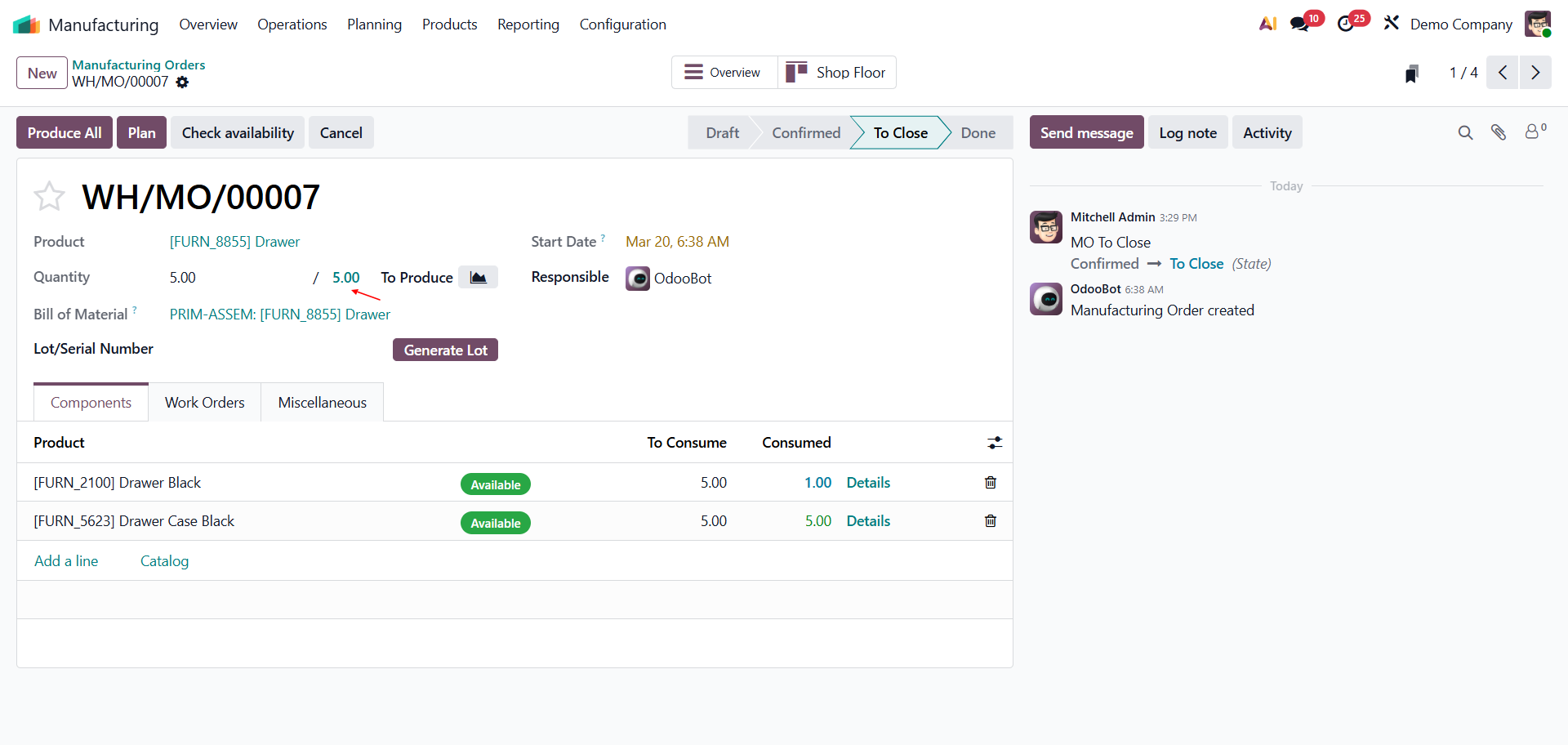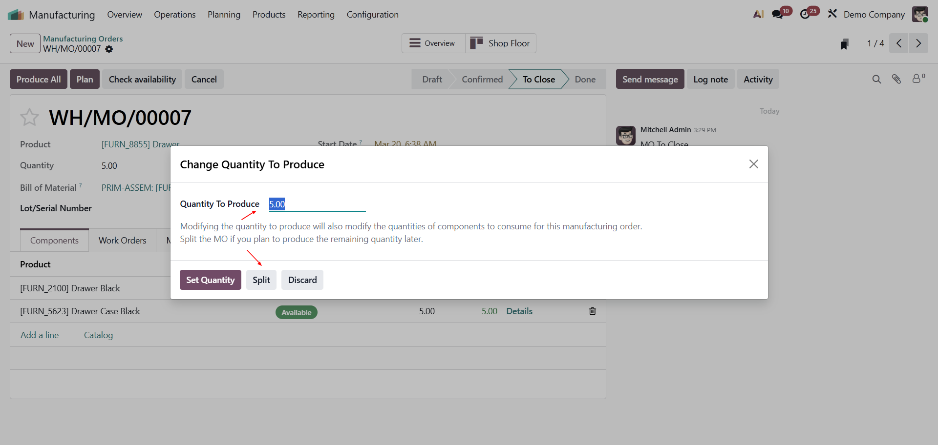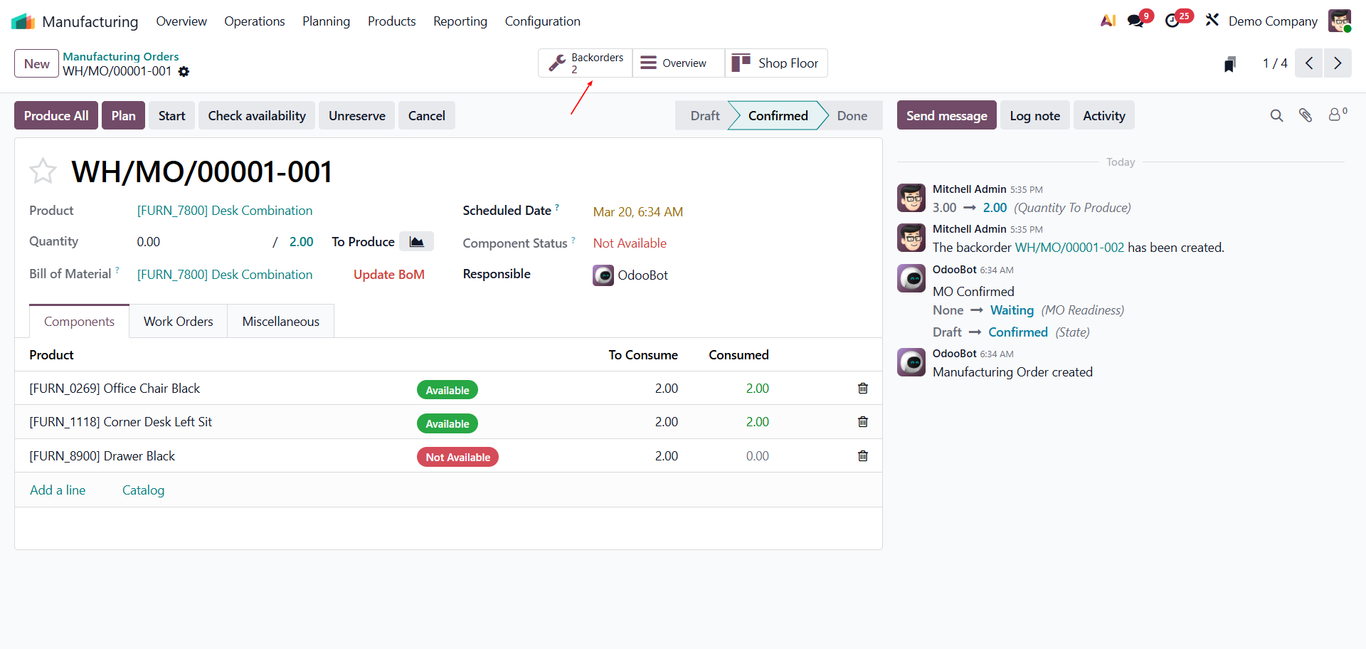 Odoo 19.2 Manufacturing Order is created but the required raw materials are not fully available users can adjust the production quantity based on available stock. The system will process the available quantity and automatically create a backorder for the remaining quantity.