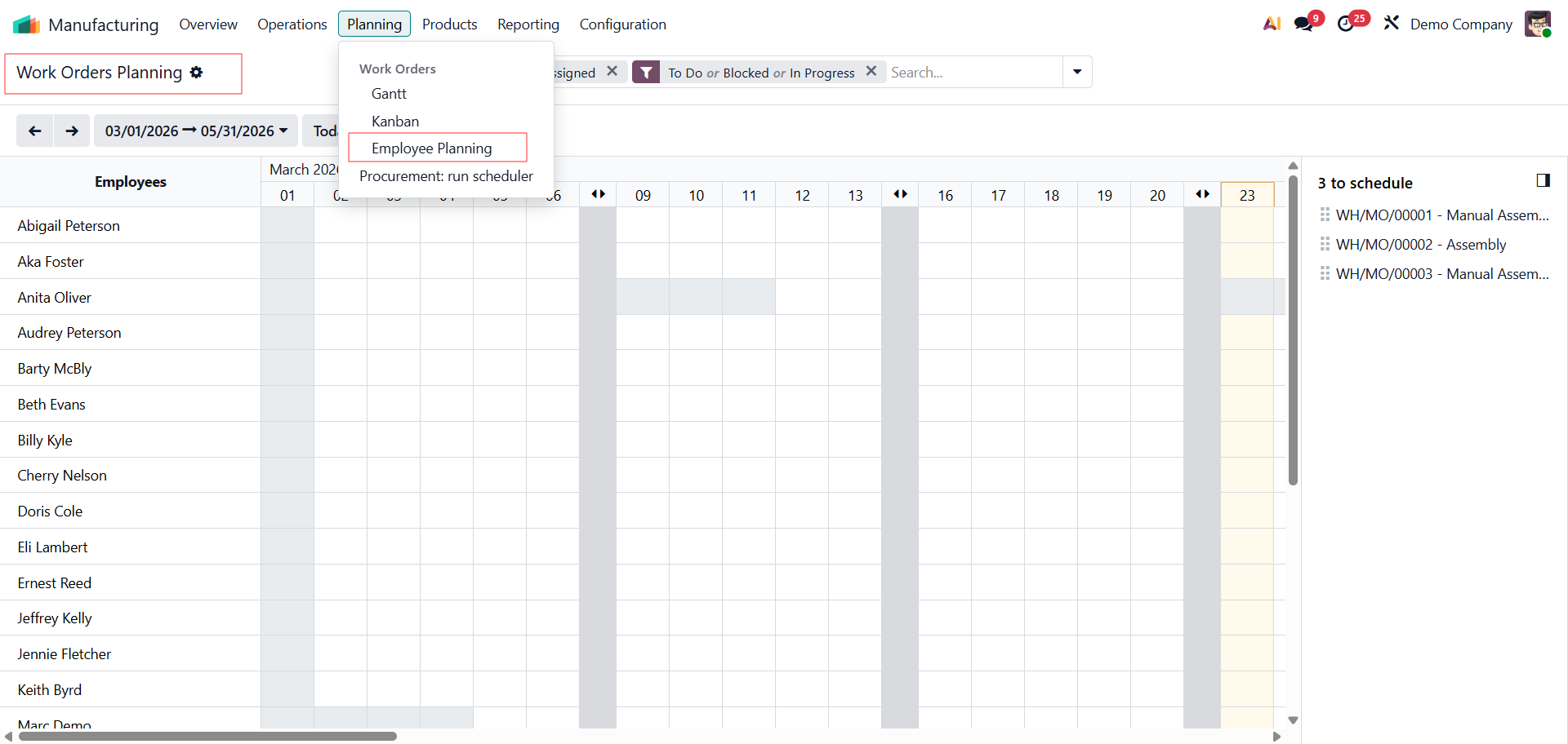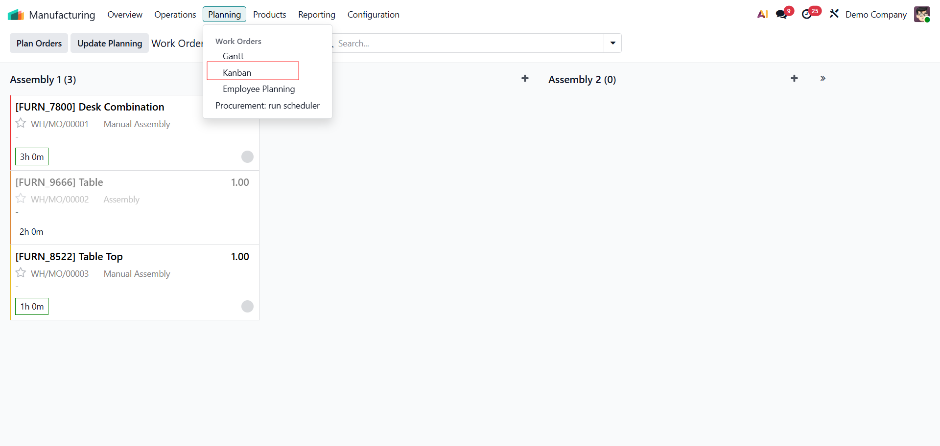 Odoo 19.2 introduces a Kanban view for work orders enabling users to visually manage and track production activities. Work orders are displayed as cards across different stages such as To Do, In Progress, and Done stages now users can easily understand the current status of operations.