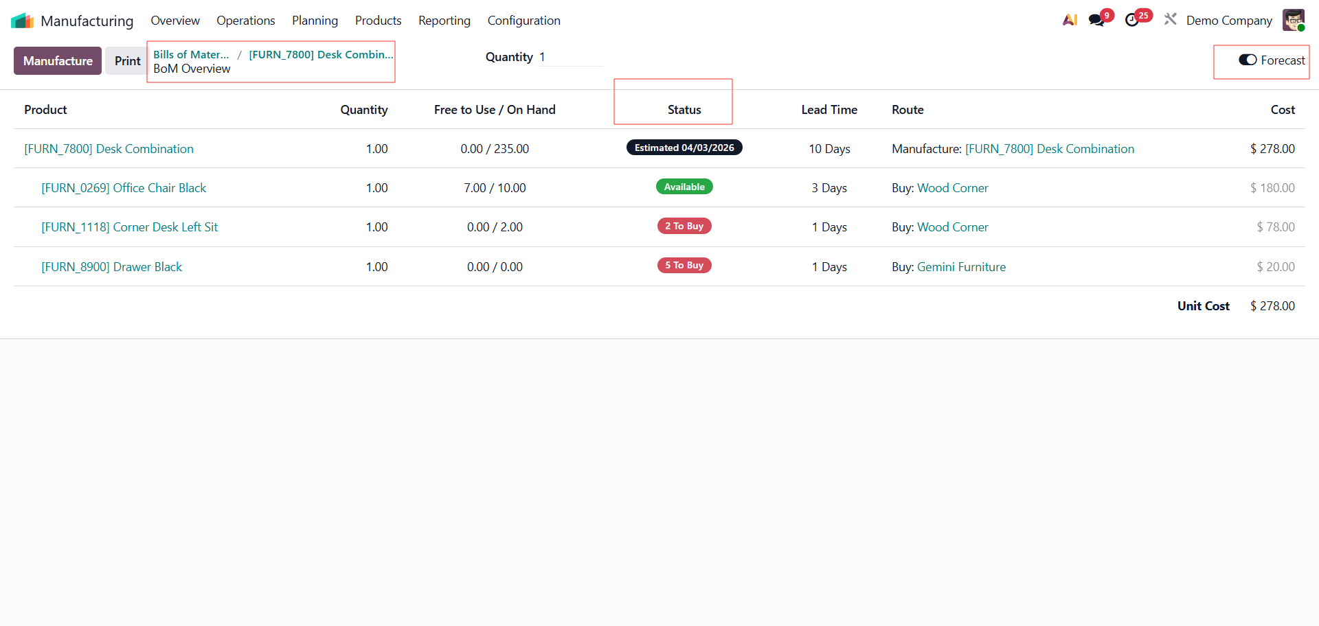 In Odoo 19.2 the Bill of Materials (BoM) forecast overview by merging the Status and Availability columns into a single unified view.