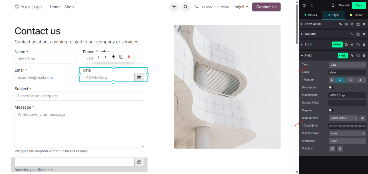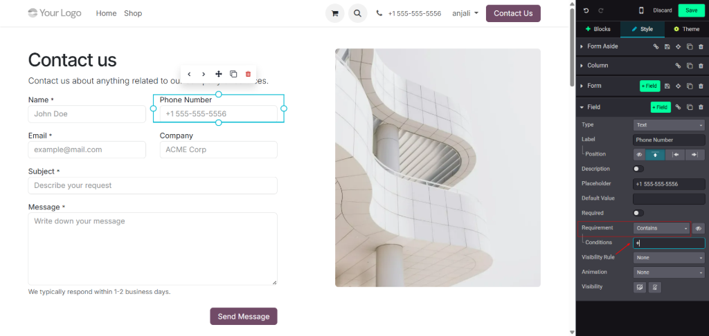 ‣ Using website edit view we can change requirement for phone number contain + sign before any contact right