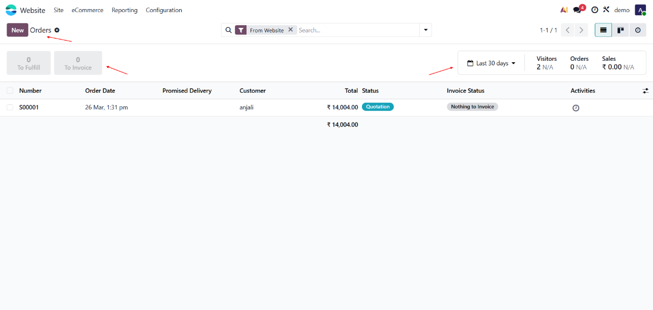 ‣ Here under the website order there is a dashboard view showing current status and sale orders in odoo 19.2.