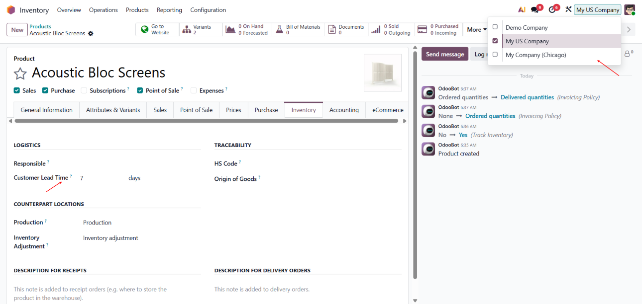 Odoo 19.2 introduces the ability to define customer lead times per company within a multi-company environment. Users can configure lead times directly in the product’s Inventory tab, allowing different delivery timelines for each company based on their operational needs.