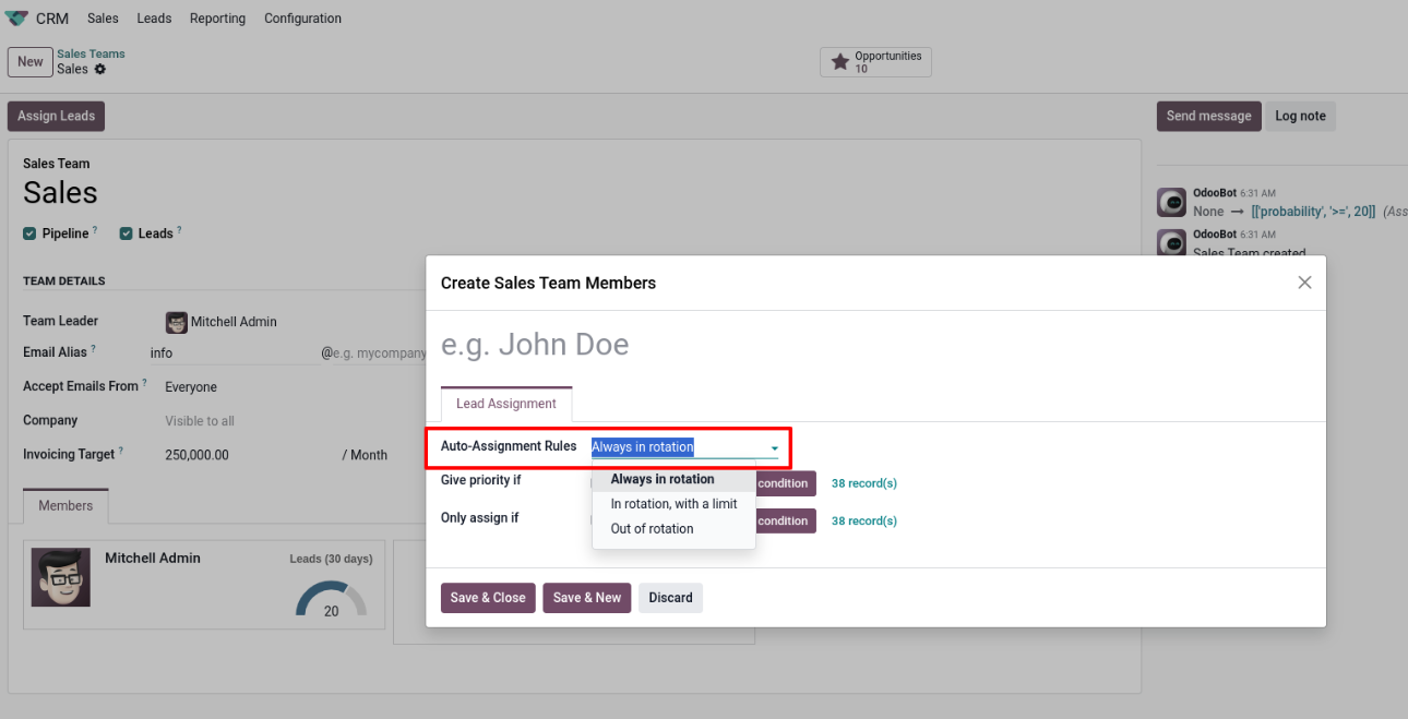 Odoo 19.2 new features introduces configurable lead distribution rules that allow automatic allocation of leads to sales team members based on predefined strategies. Users can assign leads using options such as “Always in Rotation,” “In Rotation with a Limit,” or “Out of Rotation.”