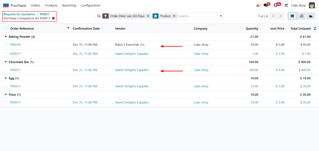➻ Odoo automatically chooses the best vendor offering the best deal for the requested ingredients.