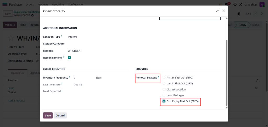 ➻ Removal strategy in odoo provides for food product first expire first out rule and avoid ingredient wastage.