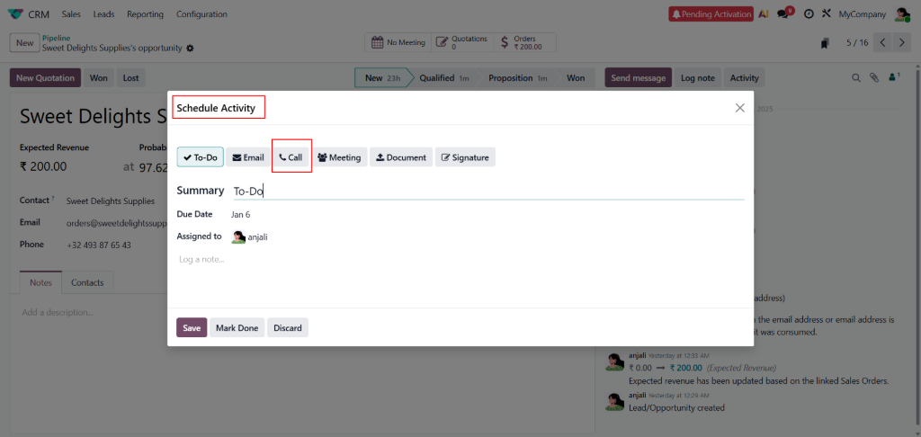 ➻ Odoo sends automatic follow-up reminders.Ensures timely customer contact and no missed opportunities.