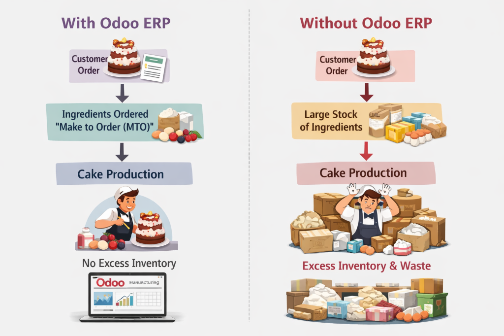 ➻ Bakery needs Feature for custom cakes and pastries here odoo provides Manufacturing app. By creating manufacturing orders based on customer demand and linking the necessary ingredients to each product. Use the Make to Order (MTO) route to order ingredients only when a customer places an order, helping you avoid excess stock.