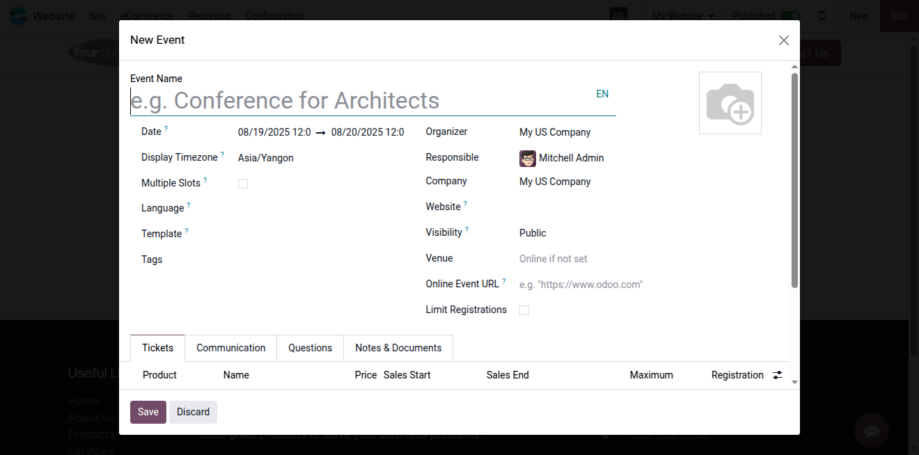 In earlier versions, ticket creation meant logging into the backend, something not every organizer had access to. Now, Odoo 19 makes it possible to create tickets right from the frontend.