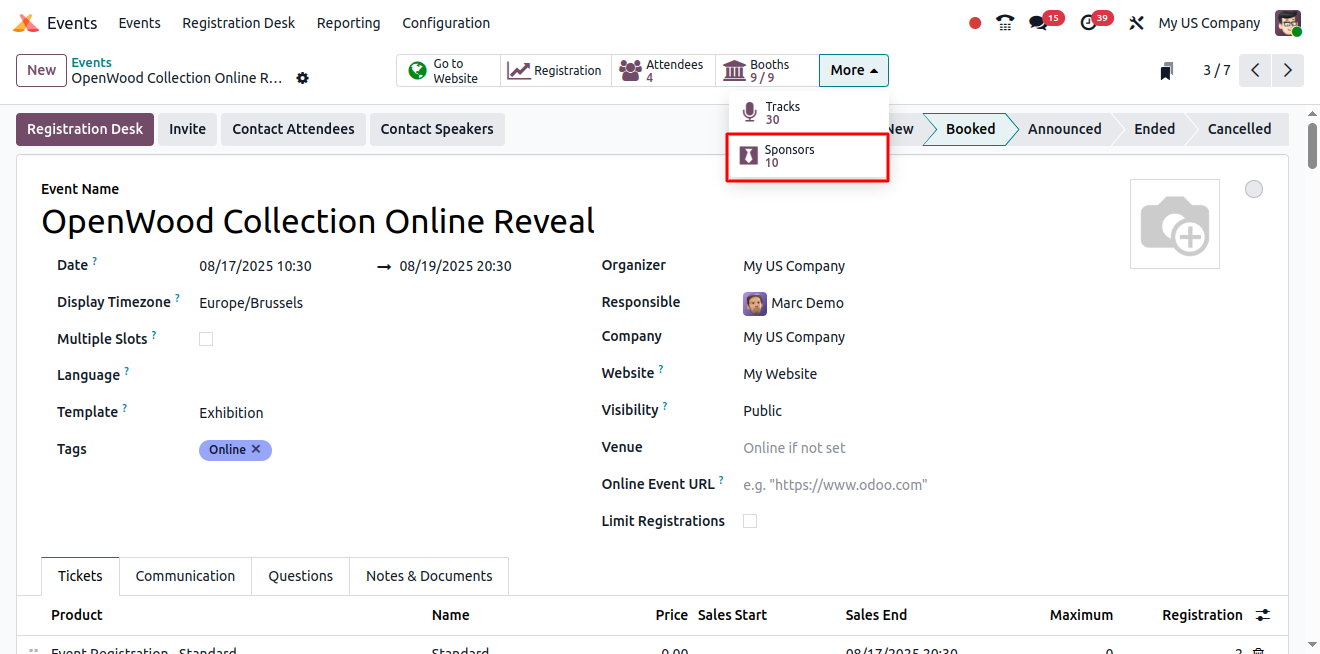 In Odoo 19, event organizers get a new way to give sponsors more recognition. With the “Show on Ticket” option, you can choose which sponsors appear directly on attendee tickets.