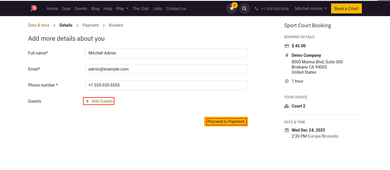 You can enter your contact details to complete the court booking.
